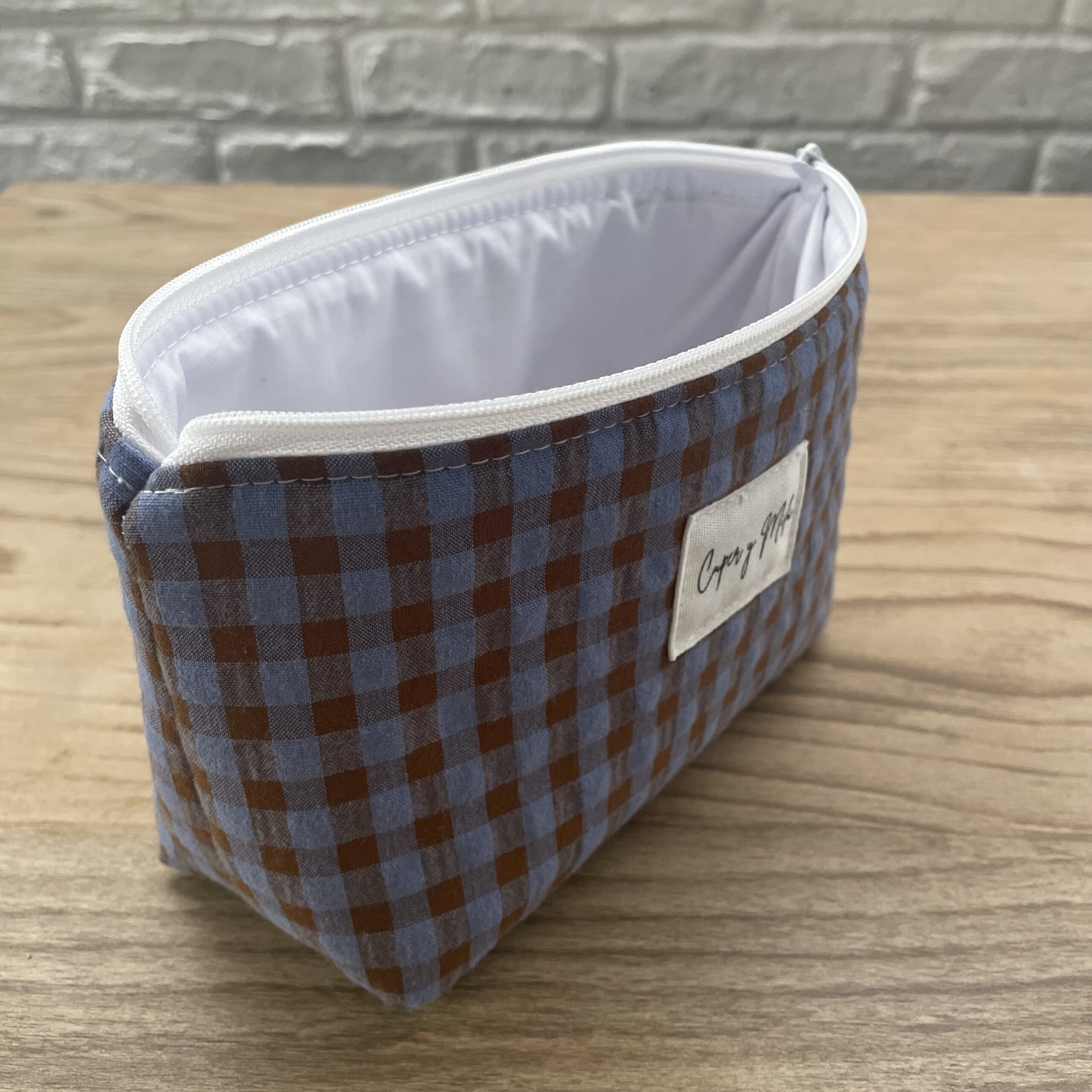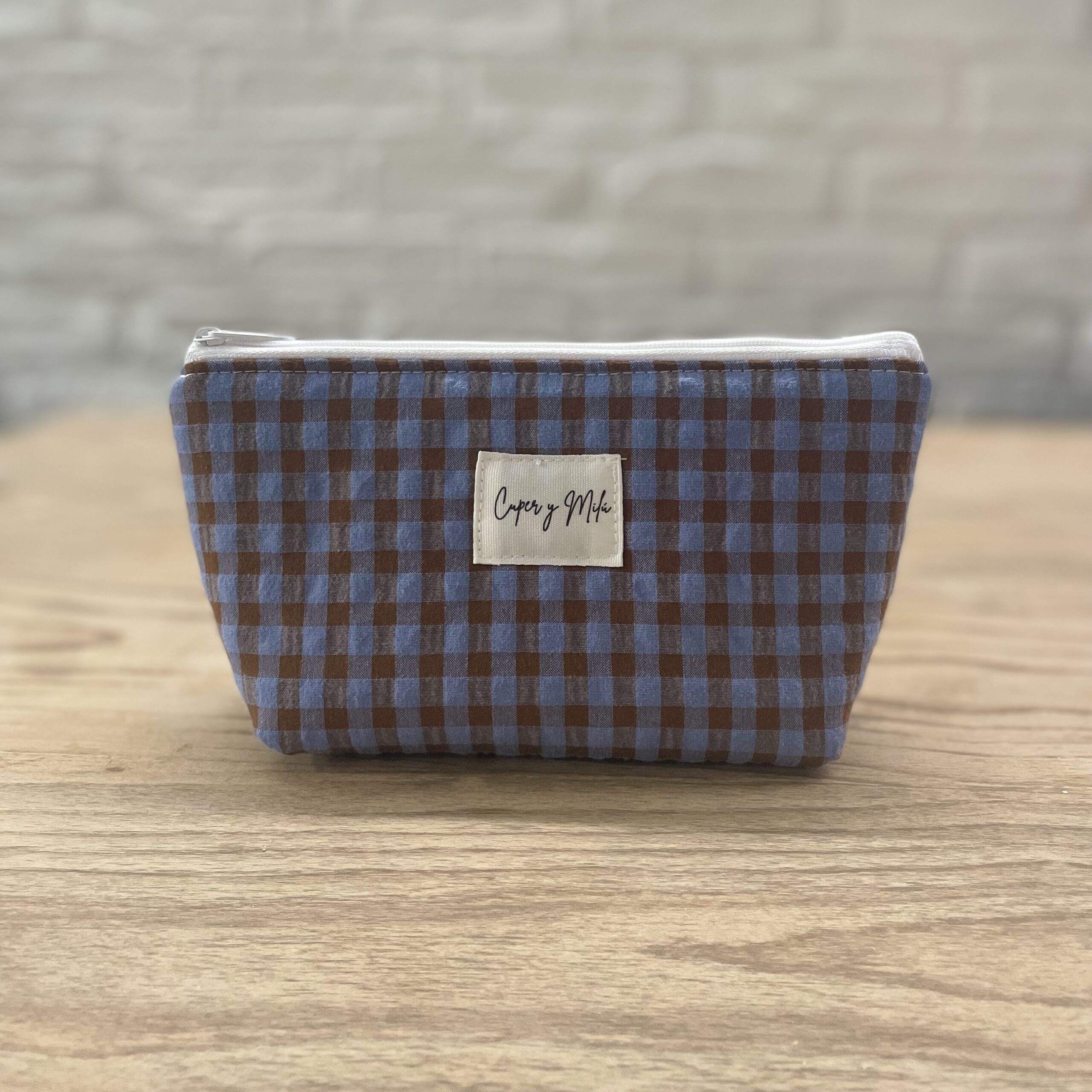 Neceser Kira mini vichi seersuker azul-marrón.